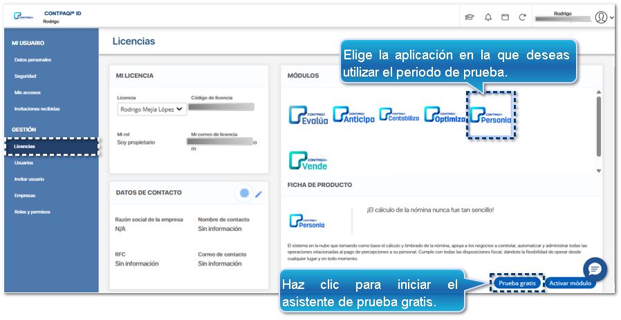 En el apartado de Módulos, selecciona la aplicación en la que deseas generar el periodo de prueba, y haz clic en el botón Prueba gratis.