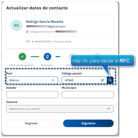 En la sección Dirección, elige el País, captura el Código postal y haz clic en el icono de búsqueda para validarlo.