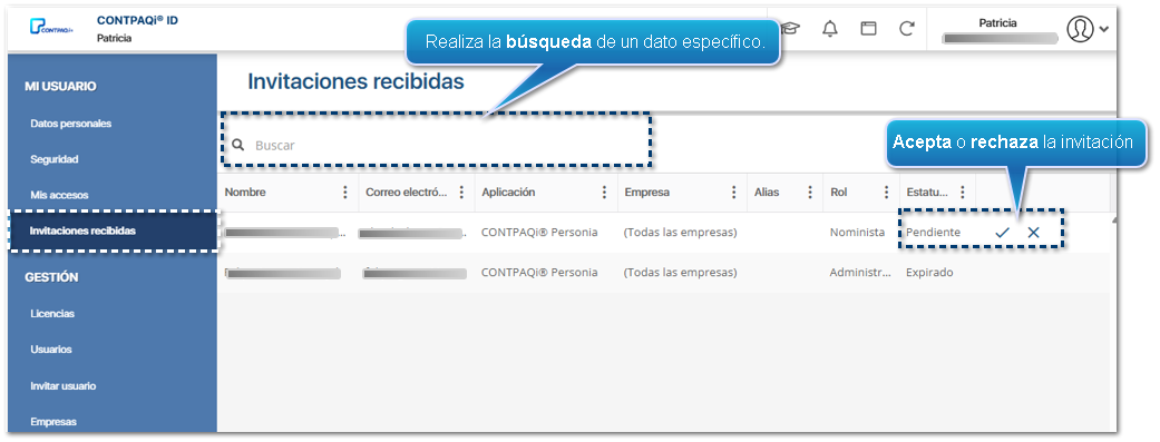 En este apartado, puedes consultar las invitaciones que te han enviado para colaborar y que aún no has aceptado, o bien que han expirado. Muestra las columnas Nombre y Correo electrónico del dueño de la licencia, Aplicación, Empresa, Alias, Rol y Estatus de la invitación.