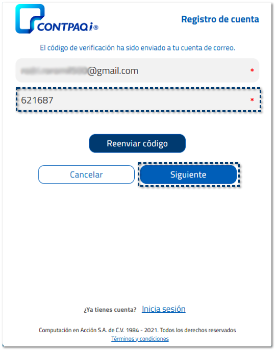 Vuelve a la ventana de Registro de cuenta, pega el código copiado en el paso anterior, y haz clic en Siguiente.