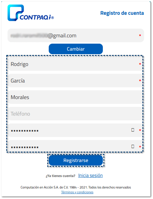 En la siguiente ventana, ingresa tus datos de registro para tu cuenta y la contraseña con la cual te autenticarás para ingresar a CONTPAQi Nube®, enseguida haz clic en Registrarse.