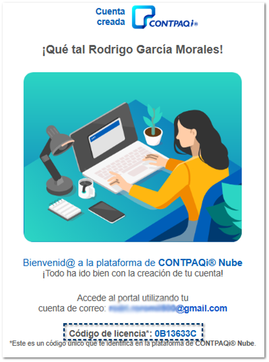 Una vez finalizado el registro recibirás en tu correo electrónico la información de tu cuenta creada, incluyendo el código de licencia con el cual podrás adquirir los sistemas CONTPAQi Nube®.