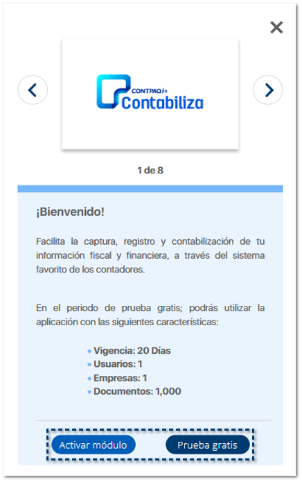 ![]() Si estas realizando el registrando a través de un correo de invitación a colaborar y continuas con el flujo, al redireccionarte al portal de aplicaciones CONTPAQi Nube®, se aceptará la invitación por lo que no será necesario que actives la prueba gratis o realices la activación de un módulo.