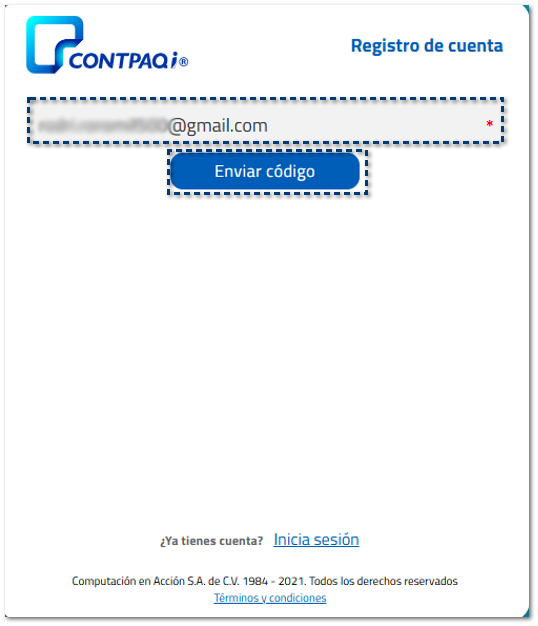 Después de leer los Términos y condiciones, posteriormente para realizar el registro captura el correo electrónico con el cual registrarás tu cuenta y haz clic en Enviar código.
