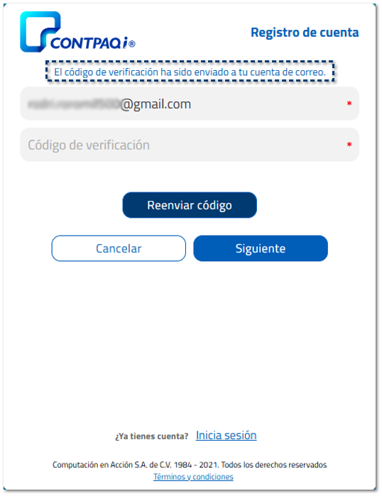 Se mostrará la siguiente ventana, indicando que recibirás un código en el correo que asignaste: