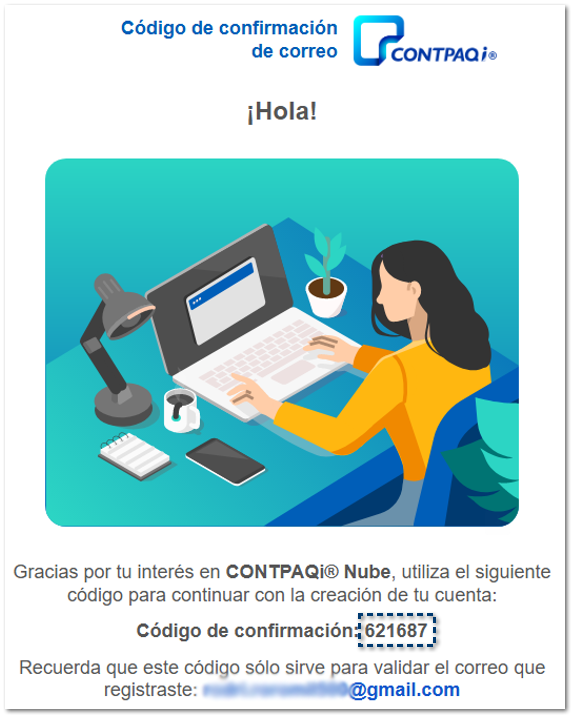 Ingresa a tu cuenta de correo, en la bandeja de entrada identifica el correo de CONTPAQi® Nube con asunto: Código de confirmación de correo, y copia el código para realizar el registro de tu cuenta.