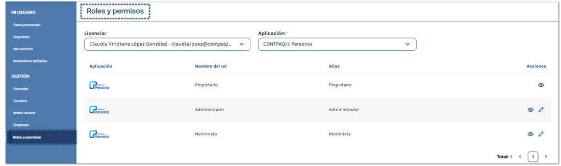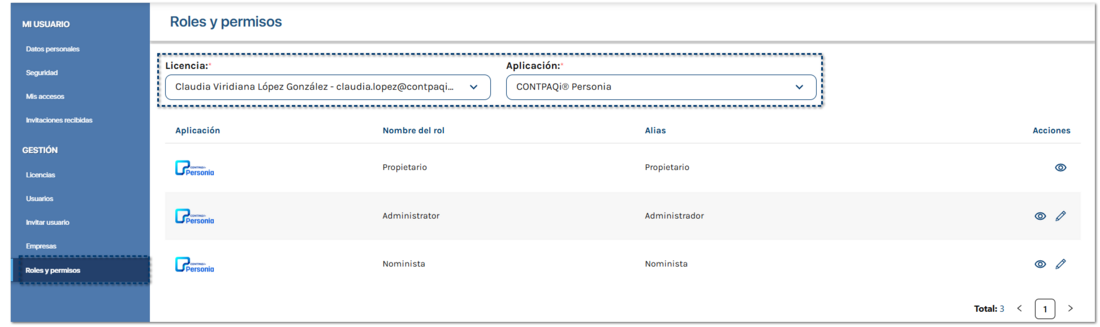 ![]() Selecciona la Licencia del propietario y la Aplicación, a la cual otorgarás los permisos correspondientes a cada rol.