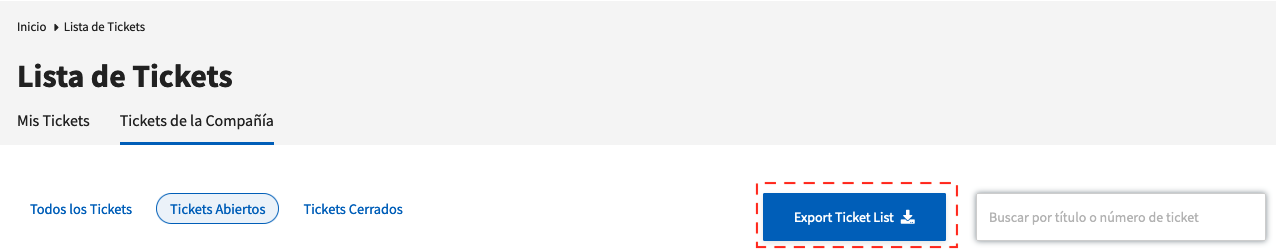 Puedes exportar la información de los Tickets a un archivo, para ello desde la sección Mis Tickets o Tickets de la Compañia, según requieras, haz clic en el botón Export Ticket List