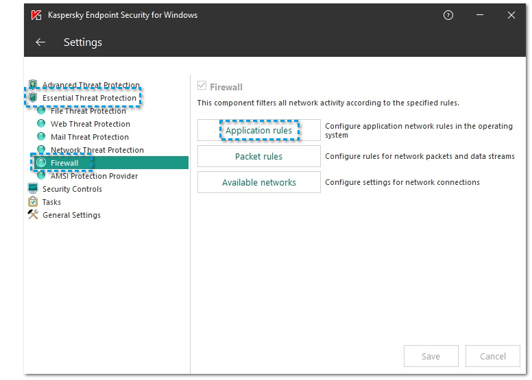 Ve a la sección Protección Esencial contra Amenazas (Essential Threat Protection),posteriormente ingresa a Firewall y haz clic en el botón Reglas de Aplicación (Application rules).