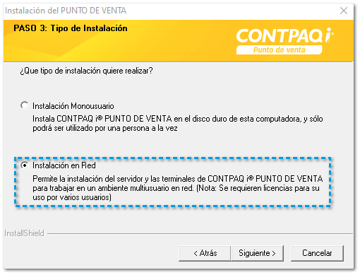 Selecciona Instalación en Red, cuando el tipo de instalación es Servidor o Terminal.