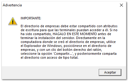Al realizar el tipo de instalación como servidor, te solicitará compartir la carpeta de Compacw; para que al realizar la instalación en las terminales, estas puedan conectarse al servidor por medio de la RED.