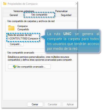 Deberás compartir la carpeta Compacw que contiene las empresas, para que se genera la ruta UNC.