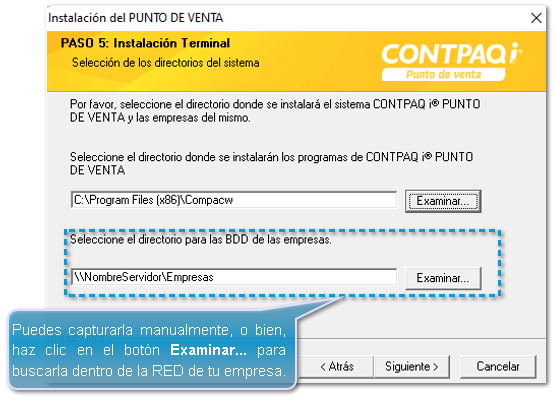 Al realizar el tipo de instalación como terminal deberás indicar la ruta UNC que se generó durante la instalación del servidor.