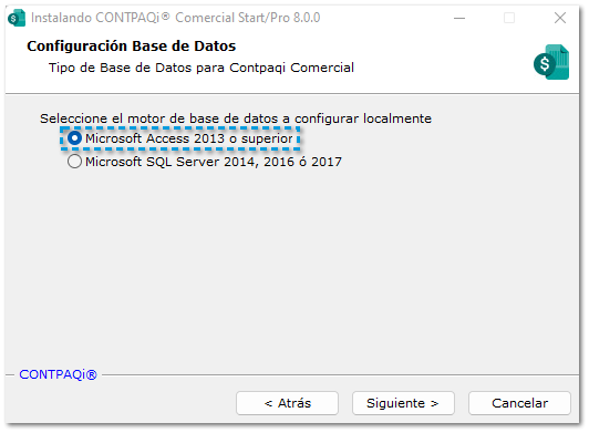 A partir de la versión 4.3.0 de CONTPAQi®Comercial Start puedes utilizar bases de datos en SQL Server®, por lo que si cuentas con una versión anterior solo podrás utilizar bases de datos en Microsoft® Access.