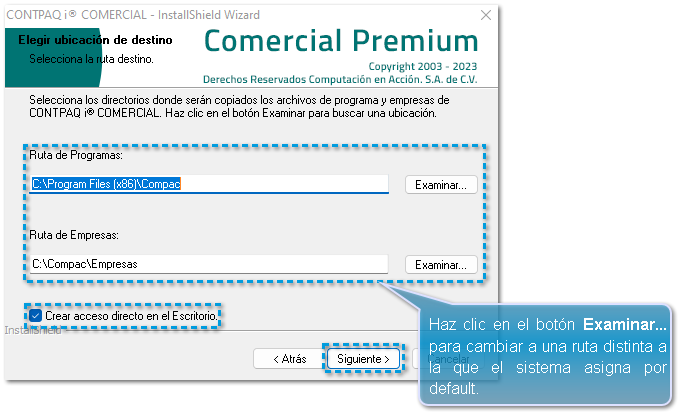 Antes deiniciar el proceso de instalación, se mostrará una ventana que te indicara las rutas por default del sistema: Ruta de Programas (Ejecutables del sistema) y la Ruta de Empresas, haz clic en el botón Siguiente.