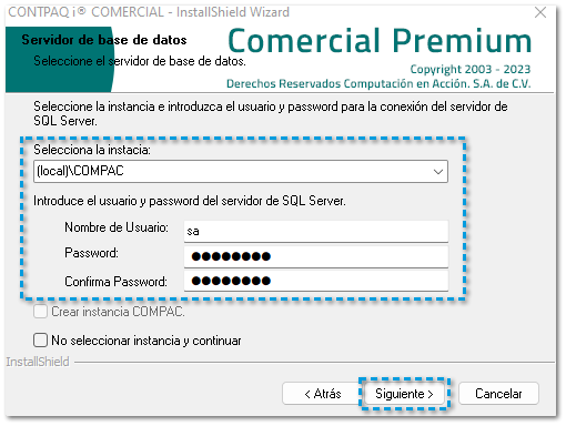 Nombre de la instancia: (Ejemplo: COMPAC).