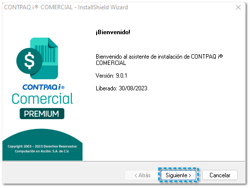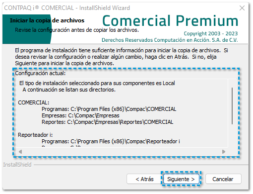 Al pasar a la siguiente ventana, se visualizará un Resumen de instalación del sistema CONTPAQi® Comercial Premium con sus respectivos complementos. Presionael botón Siguiente paracontinuar con la instalación.