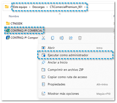 En la carpeta descomprimida en la que se descargó el sistema, encontrarás el instalador CONTPAQi® Comercial Premium, haz clic derecho sobre él yejecútalo como Administrador.