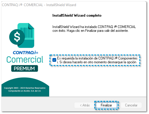 Al término del proceso, se mostrará la siguiente ventana, que tiene la opción: Es requerida la instalación de CONTPAQi® Componentes i. Si deseas hacerlo en otro momento deshabilita la opción, en este caso la dejaremos habilitada, posteriormente haz clic en Finalizar.