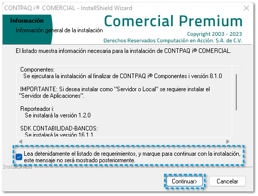 Al término del proceso, aparecerá una ventana de Información general de la instalación de CONTPAQi® Herramientas complementarias, lee detenidamente dicha información, por último, para iniciar con la instalación es necesario habilitar la opción correspondiente y dar clic en Continuar.