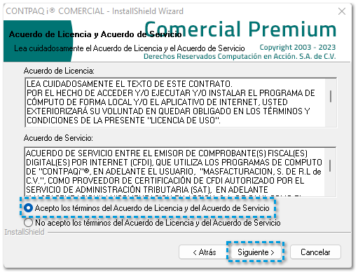 Lee el Acuerdo de Licencia y Acuerdo de Servicio; acepta los términos y haz clic en Siguiente.