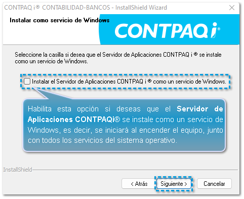 Si deseas que el Servidor de AplicacionesCONTPAQi® inicie como un servicio de Windows, habilita la siguiente opción y haz clic en Siguiente.