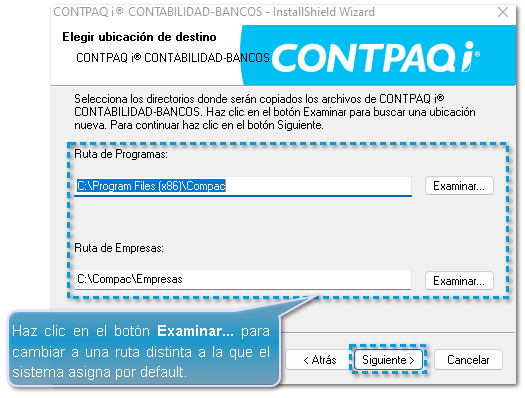 Antes deiniciar el proceso de instalación, se mostrará una ventana que te indicará las rutas por default del sistema: Ruta de Programas (Ejecutables del sistema) y la Ruta de Empresas, haz clic en el botón Siguiente.