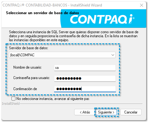 Selecciona el servidorde base de datos que hayas instalado previamente en tu equipo, captura el nombre de usuario sa, la contraseña de la instancia y la confirmación de la misma.