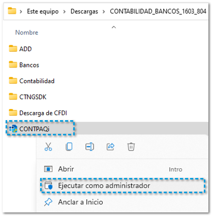 En la carpeta descomprimida en la que se descargó el sistema, encontrarás el instalador CONTPAQi® Contabilidad - Bancos, haz clic derecho sobre él yejecútalo como Administrador para iniciar la instalación.