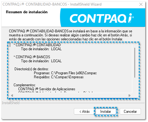 En la siguiente ventana, se visualizará un Resumen de instalación del sistema CONTPAQi® Contabilidad - Bancos con sus respectivos complementos. Presionael botón Instalar paracontinuar con dicha instalación.