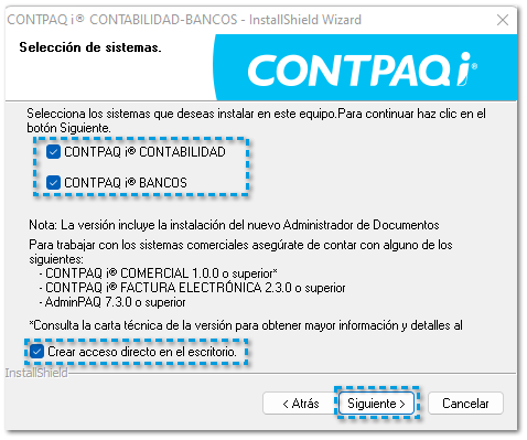 Selecciona los sistemas a instalar, en este caso realizaremos la instalación de ambos sistemas (CONTPAQi® Contabilidad y CONTPAQi® Bancos).