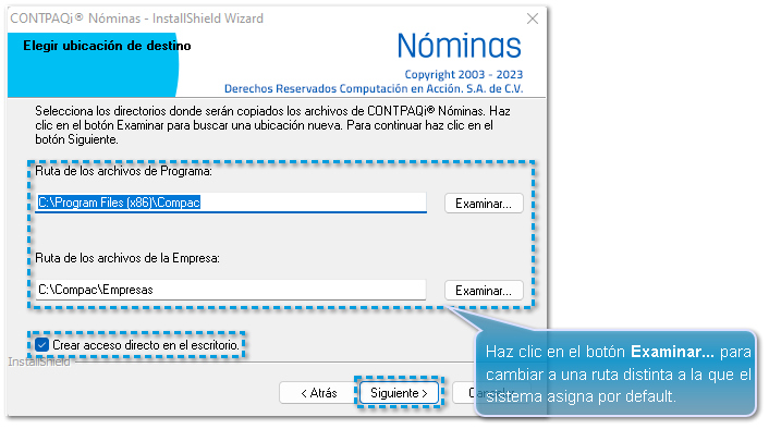 Antes deiniciar el proceso de instalación, se mostrará una ventana que te indicara las rutas por default del sistema: Ruta de Programas (Ejecutables del sistema) y la Ruta de Empresas, haz clic en el botón Siguiente.