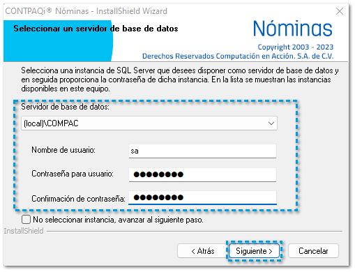 Selecciona el servidorde base de datos que hayas instalado previamente en tu equipo. Captura el nombre de usuario sa, la contraseña de la instancia y la confirmación.