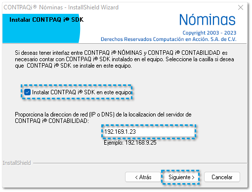 Si no deseas realizar la instalación de esta herramienta, no habilites la opción Instalar CONTPAQi® SDK en este equipo, y haz clic en Siguiente: