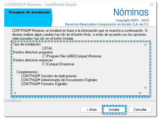 Se visualizará un Resumen de instalación del sistema CONTPAQi® Nóminas con sus respectivos complementos. Presionael botón Instalar paracontinuar con dicha instalación.