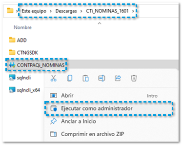 En la carpeta descomprimida en la que se descargó el sistema, encontrarás el instalador CONTPAQi® Nóminas, haz clic derecho sobre él yejecútalo como Administrador para iniciar la instalación.