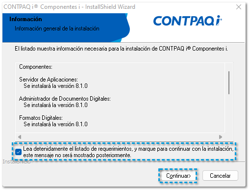 Al término del proceso, aparecerá una ventana de información general de la instalación de CONTPAQi® Herramientas complementarias, lee detenidamente dicha información, por último, para iniciar con la instalación es necesario habilitar la opción correspondiente y dar clic en Continuar.