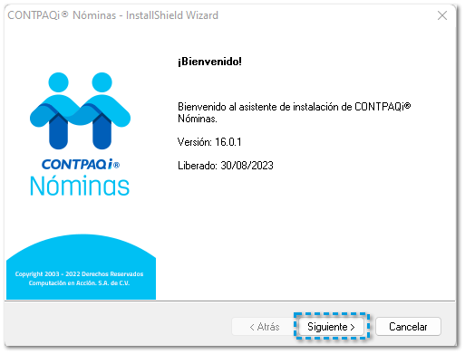 Posteriormente la ventana de Bienvenida, haz clic en el botón Siguiente para continuar.