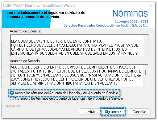 Lee cuidadosamente los acuerdos de licencia y servicio. Acepta los términos y haz clic en el botón Siguiente.