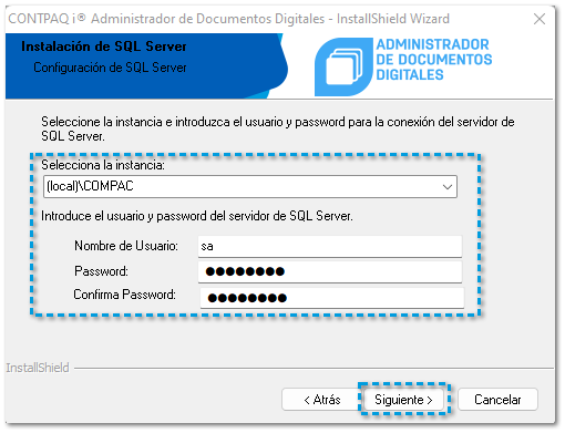 En donde solicitará la configuración de SQL Server®, asigna la instancia, captura el nombre de usuario sa, la contraseña de la instancia y la confirmación.