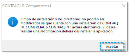 En caso de que tengas una instalación de CONTPAQi® Comercial Premium en el equipo, te mostrará el siguiente mensaje, y no serpa posible modificar el tipo d instalación ni las rutas del sistema.