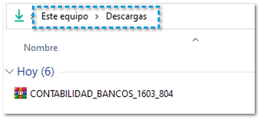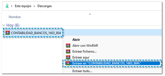 Identifica el archivo con extensión .zip el cual contiene el nombre del sistema descargado; haz clic derecho sobre el archivo y selecciona la opción Extraer en CONTABILIDAD_BANCOS_1603_804.