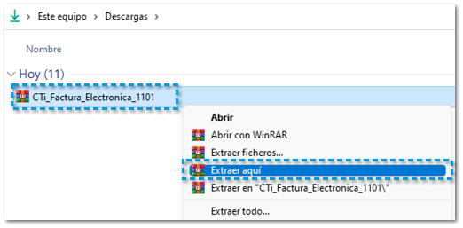 Identifica el archivo con extensión .zip el cual contiene el nombre del sistema descargado; haz clic derecho sobre el archivo y selecciona la opción Extraer aquí.