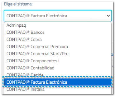 En el campo Elige el sistema, selecciona el sistema que deseas instalar (Ejemplo: CONTPAQi®Factura electrónica).