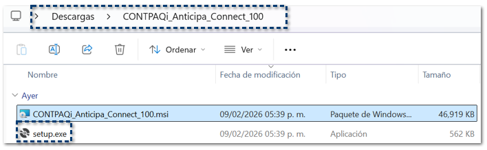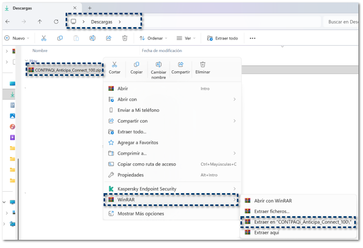 Identifica el archivo CONTPAQi_Anticipa_Connect_100.zip; haz clic derecho sobre el y selecciona la opción Extraer en "CONTPAQi_Anticipa_Connect_100\".