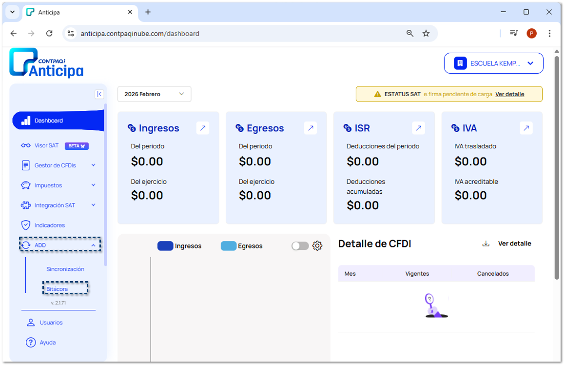 Desde la empresa de CONTPAQi Anticipa nube ingresar al menú ADD y elige la opción Bitácora.