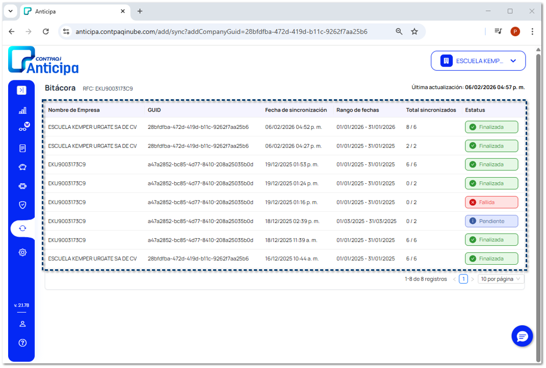 La bitácora de sincronización muestra el historial de sincronizaciones realizadas en la empresa de CONTPAQi Anticipa hacía el ADD de CONTPAQi Contabilidad®.