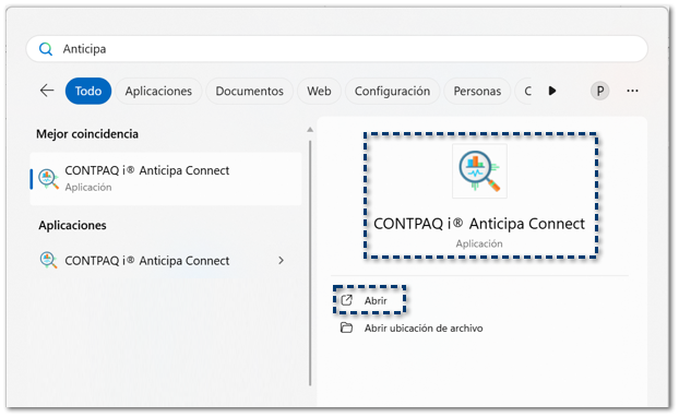 Desde tu equipo de Windows® busca la herramienta CONTPAQi Anticipa Connect y haz clic en Abrir.