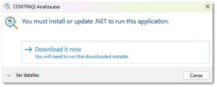 Si tu equipo no tiene instalado Microsoft ASP.NET Core 8.0.22 o superior, al ingresar se mostrará el siguiente mensaje: