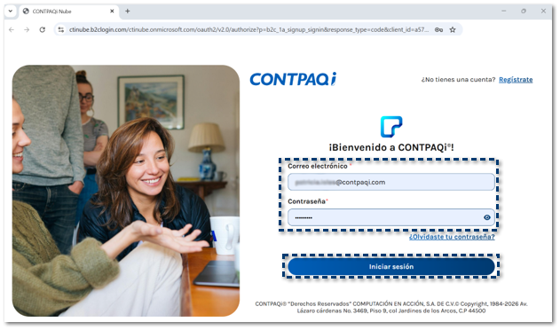 En la siguiente ventana, debes capturar el usuario y contraseña de tucuenta CONTPAQi® Nube. Para continuar haz clic en Iniciar Sesión.
